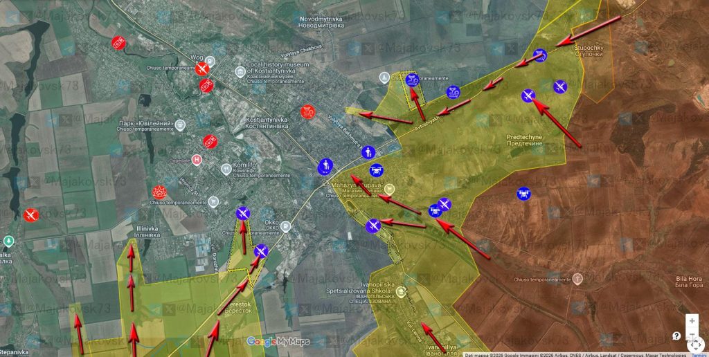 Ταυτόχρονα, ο ρωσικός Στρατός πραγματοποιεί έφοδο σε ολόκληρη την ουκρανική βιομηχανική πόλη Κωστιαντίνιβκα (Κοσταντινόφκα).