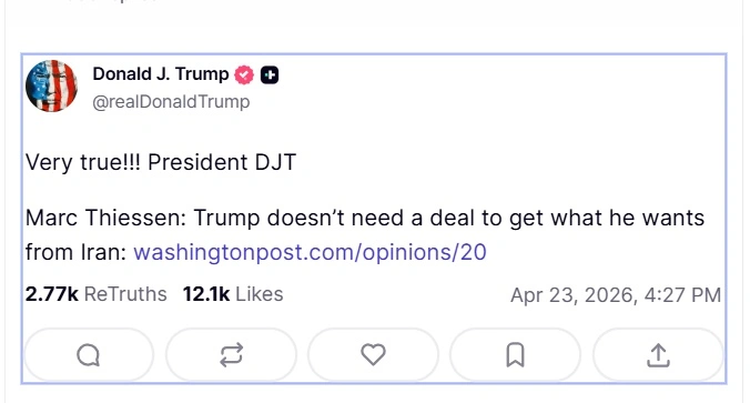 Το απόγευμα της Πέμπτης (23/4/2026), ο πρόεδρος των ΗΠΑ, Ντόναλντ Τραμπ, αναδημοσίευσε στο μέσο κοινωνικής δικτύωσης Truth Social άρθρο του Marc Thiessen από την Washington Post, το οποίο αναλύει τη στρατηγική που θα μπορούσαν να ακολουθήσουν οι ΗΠΑ στον πόλεμο με το Ιράν το επόμενο διάστημα.