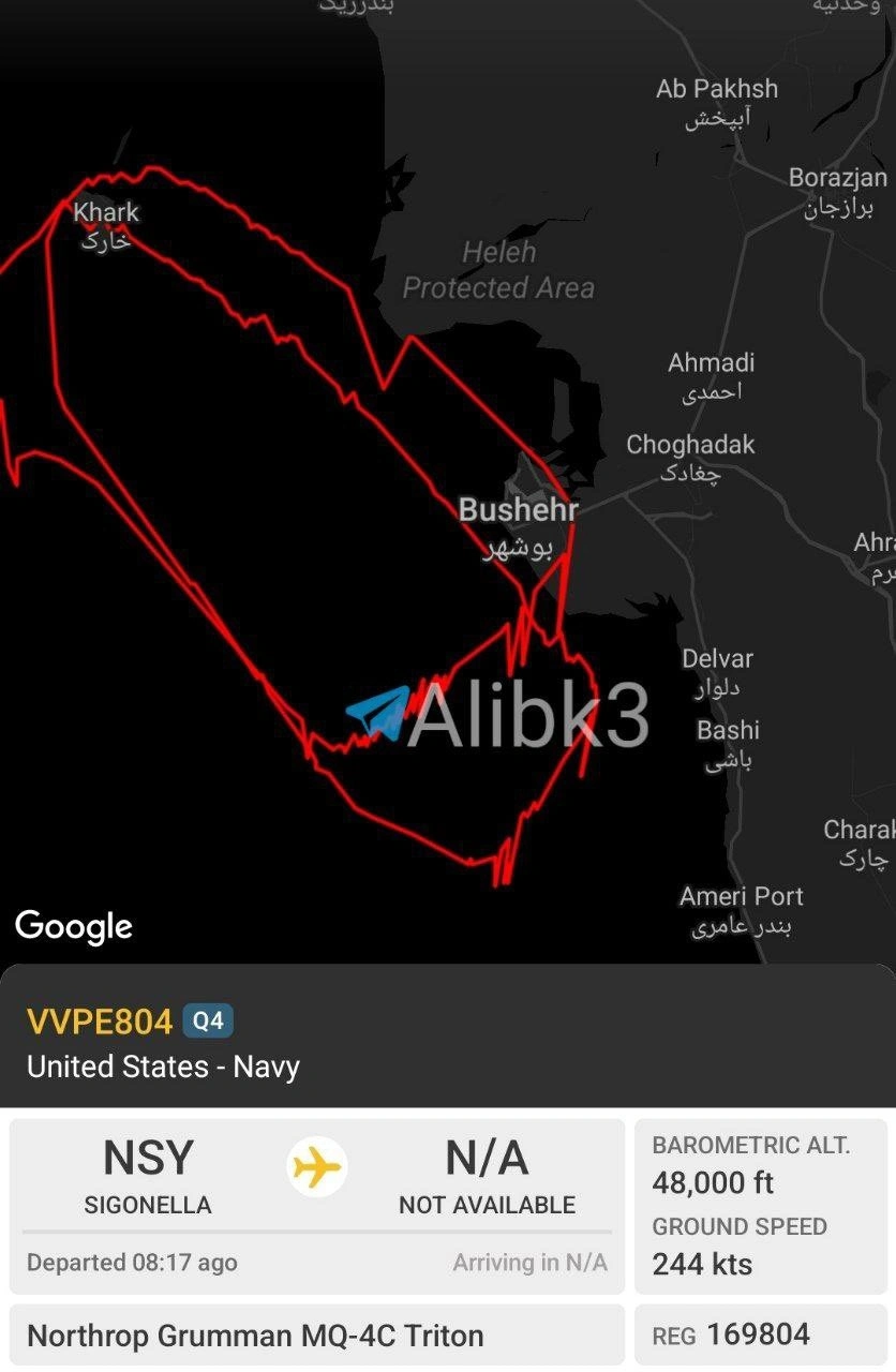 Μάλιστα αμερικανικό drone MQ-4C καταγράφηκε σε τετράωρη αποστολή επιτήρησης πάνω από την ιρανική πόλη Μπουσέρ και το νησί Kharg στον Κόλπο.