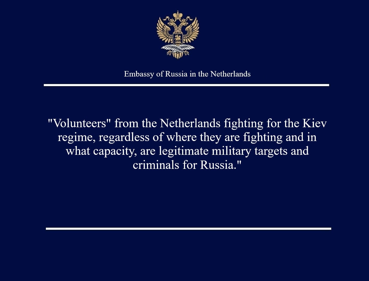 Οι «εθελοντές» από την Ολλανδία που πολεμούν για το καθεστώς του Κιέβου, ανεξαρτήτως θέσης ή ρόλου, θεωρούνται από τη Ρωσία νόμιμοι στρατιωτικοί στόχοι και εγκληματίες».