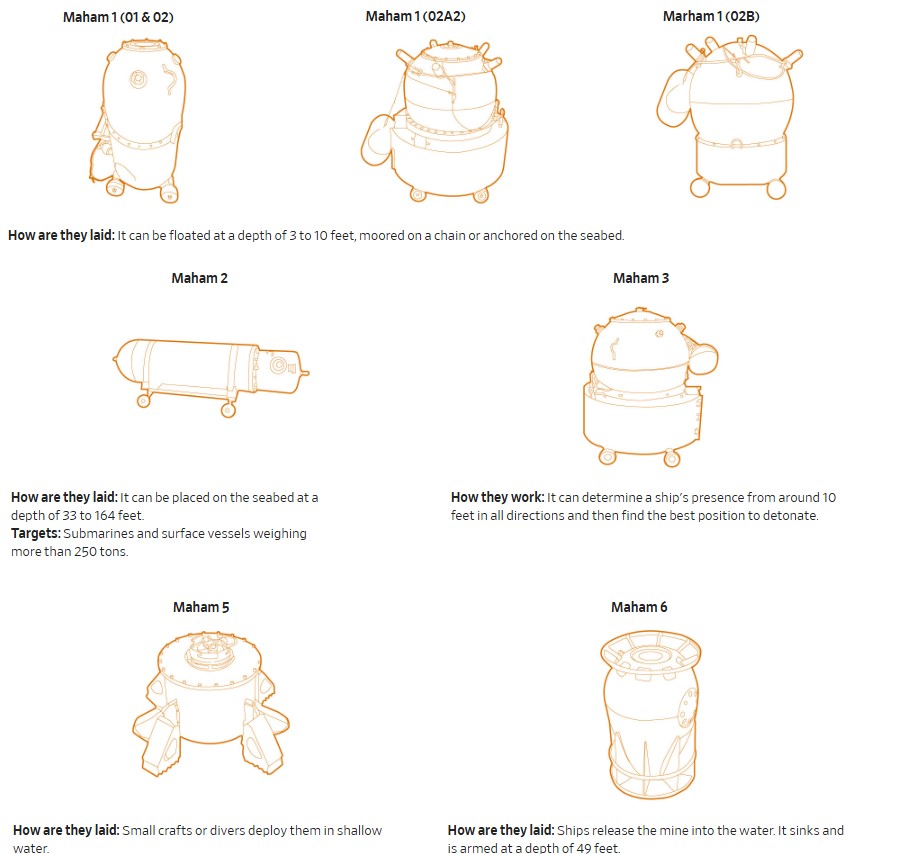 Iστότοπος του αμερικανικού στρατού περιγράφει έναν τύπο ιρανικής νάρκης, την Maham 1, ως ένα κυκλικό εξάρτημα της δεκαετίας του 1980, σχεδιασμένο να επιπλέει σε νερά βάθους έως ενός μέτρου, το οποίο είναι εξοπλισμένο με πέντε κέρατα που, όταν χτυπηθούν, μπορούν να πυροδοτήσουν έως και 120 κιλά εκρηκτικών. Οι νάρκες είναι αγκυροβολημένες σε αλυσίδα ή αγκυρωμένες στον βυθό της θάλασσας.