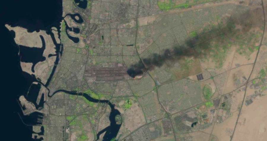 Η χρήση δορυφόρων Landsat από το Γεωλογικό Ινστιτούτο των Ηνωμένων Πολιτειών εντόπισε μεγάλες πυρκαγιές. Μία από τις εικόνες της Δευτέρας έδειχνε φωτιά στο Διεθνές Αεροδρόμιο του Ντουμπάι, που προκλήθηκε από ιρανικό drone. Η στήλη μαύρου καπνού υψώθηκε πάνω από τον αεροσταθμό, που θεωρείται ο πιο πολυσύχναστος διεθνής στον κόσμο.