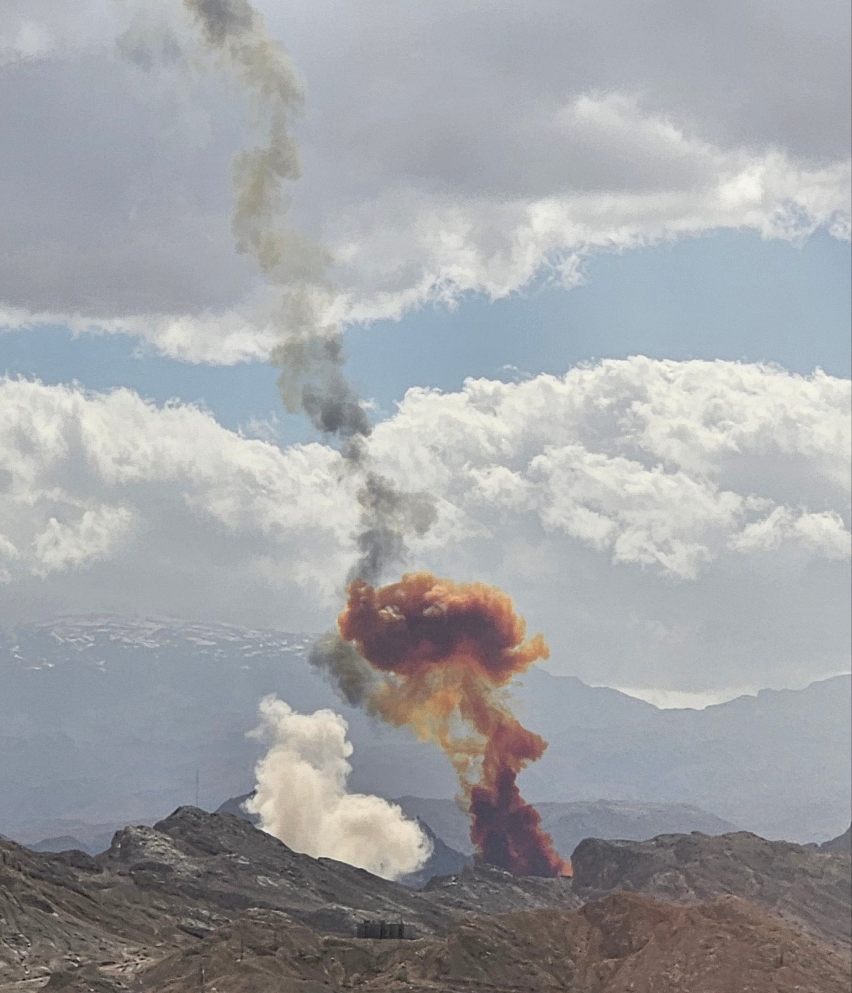 Οι τρεις φωτογραφίες που εδαν το φως της δημοσιότητας απεικονίζουν τεράστιες στήλες πορτοκαλοκόκκινου καπνού και φωτιάς να υψώνονται από το έδαφος, σε μια έρημη, ορεινή περιοχή.