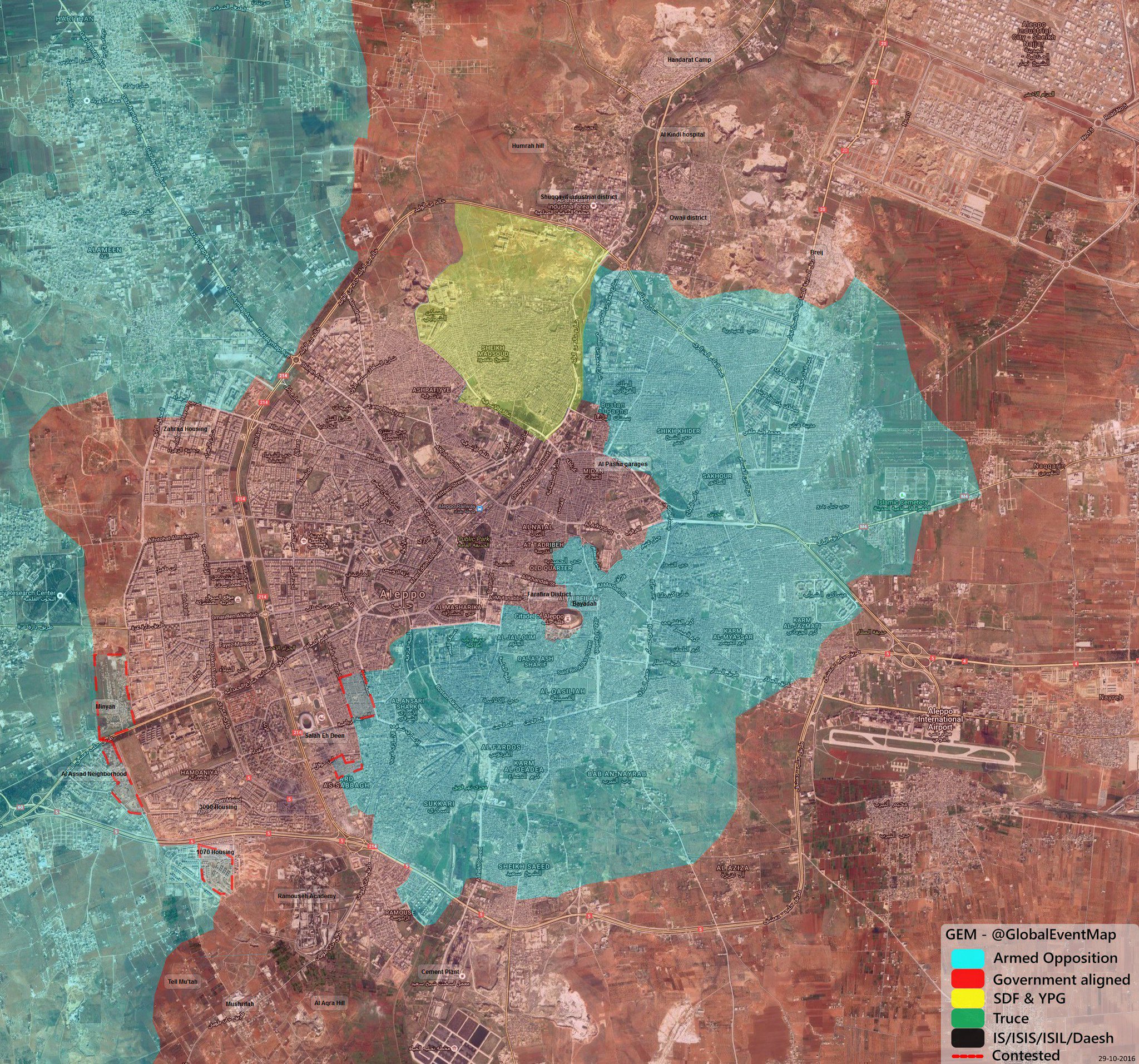 Η σημερινή κατάσταση στο Χαλέπι: Με το μπλέ οι ισλαμιστές αντάρτες (συμπεριλαμβανομένου και του θύλακα μέσα στην πόλη) , με το σκούροκόκκινο οι κυβερνητικές δυνάμεις, με το κίτρινο οι δυνάμεις του YPG/SDF. Δείτε τη φωτο σε μεγαλύτερη ανάλυση εδώ