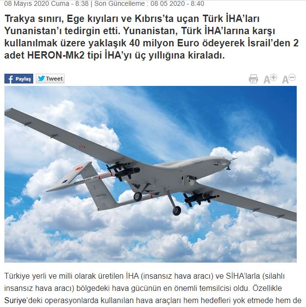 «Τα τουρκικά UAV έκαναν την Ελλάδα νευρική καθώς τα τουρκικά μη επανδρωμένα εναέρια οχήματα πετούν στα σύνορα της Θράκης, στις ακτές του Αιγαίου και στην Κύπρο γι αυτό η Αθήνα αποφάσισε να νοικιάσει δύο ισραηλινά UAV τύπου ‘2 HERON-Mk2’», γράφει η τουρκική Gazete Vatan με ένα τόνο ειρωνίας.