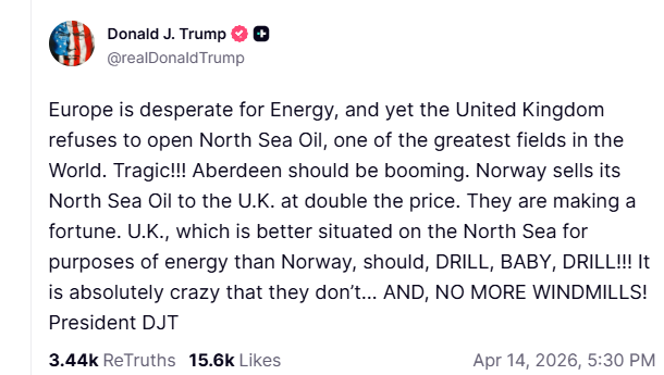 «Το Αμπερντίν θα έπρεπε να βρίσκεται σε άνθηση. Η Νορβηγία πουλάει το πετρέλαιο της Βόρειας Θάλασσας στο Ηνωμένο Βασίλειο στο διπλάσιο της τιμής. Κάνουν μια περιουσία. Το Ηνωμένο Βασίλειο, το οποίο βρίσκεται σε καλύτερη θέση στη Βόρεια Θάλασσα για ενεργειακούς σκοπούς από τη Νορβηγία, θα έπρεπε να κάνει: DRILL BABY, DRLL!!!», έγραψε ο Αμερικανός πρόεδρος.
