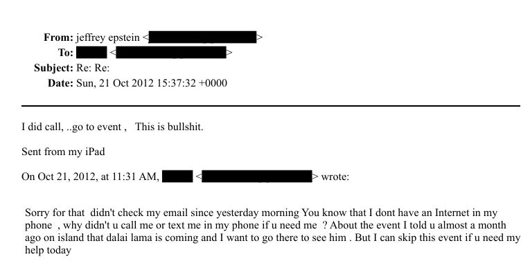 Χαρακτηριστικά, σε ένα email από την 21η Οκτωβρίου 2012, ο Έπσταϊν ενημερώνει μια επαφή, που δεν κατονομάζεται, ότι επρόκειτο να παραστεί σε μια εκδήλωση σε ένα ανώνυμο νησί, στην οποία θα συμμετείχε και ο Δαλάι Λάμα.