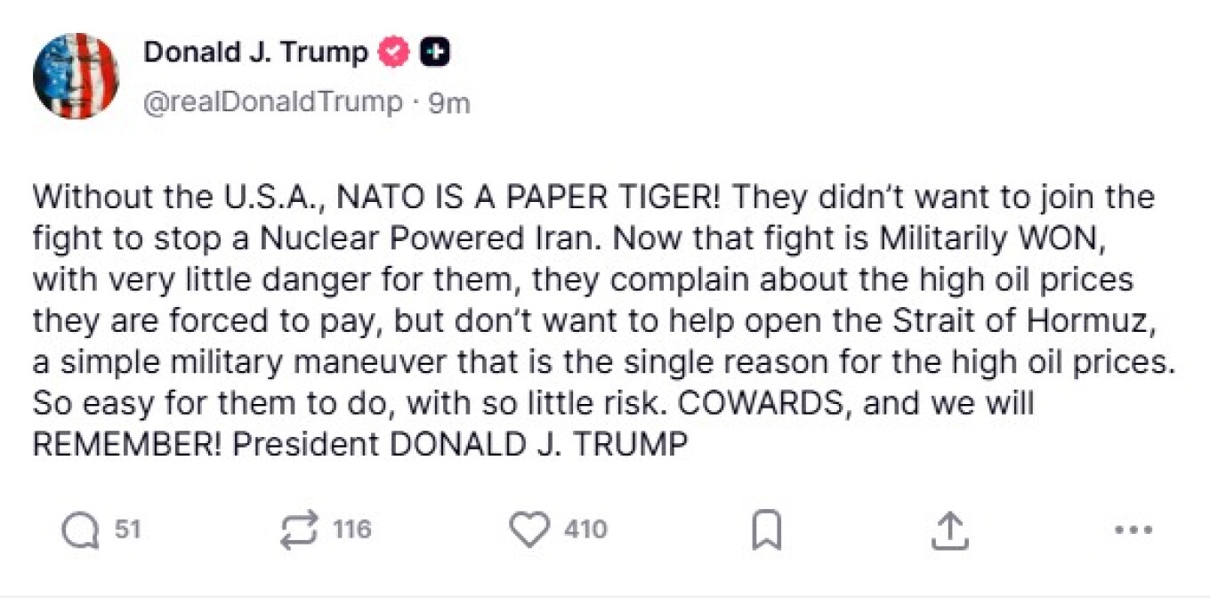 Ο Ντόναλντ Τραμπ «χτύπησε» ξανά, εξαπολύοντας μια σφοδρή, σφοδρότατη επίθεση κατά του ΝΑΤΟ, χαρακτηρίζοντάς το «χάρτινη τίγρη» χωρίς την υποστήριξη των ΗΠΑ. Στην ανάρτησή του, ο Τραμπ δεν μασάει τα λόγια του, κατηγορώντας τους συμμάχους για υποκρισία και δειλία απέναντι στην ιρανική απειλή.