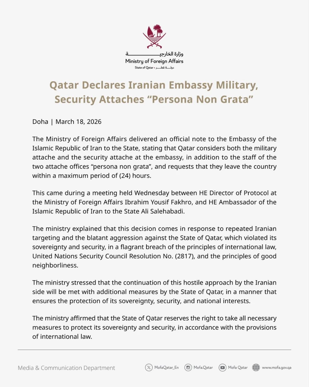 Το υπουργείο τόνισε ότι η συνέχιση αυτής της εχθρικής προσέγγισης από την ιρανική πλευρά θα αντιμετωπιστεί με πρόσθετα μέτρα από το Κράτος του Κατάρ, κατά τρόπο που να διασφαλίζει την προστασία της κυριαρχίας, της ασφάλειας και των εθνικών του συμφερόντων, ενώ δήλωσε πως θεωρεί τόσο τον στρατιωτικό ακόλουθο όσο και τον ακόλουθο ασφαλείας της πρεσβείας , καθώς και το προσωπικό των δύο γραφείων των ακολούθων, «persona non grata».