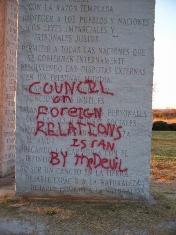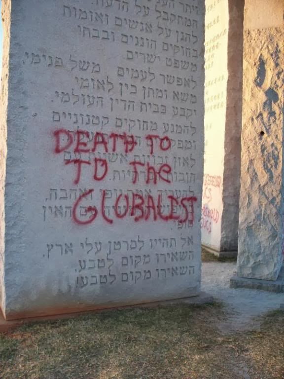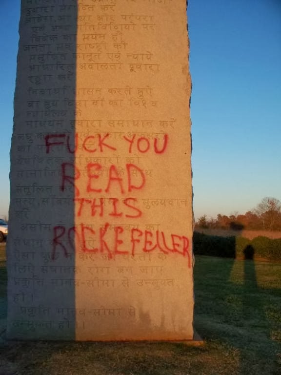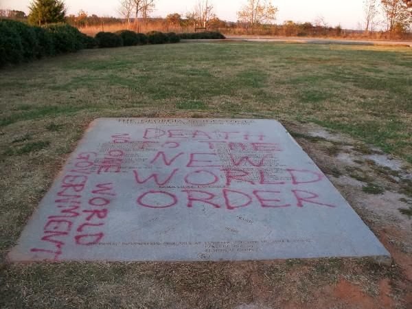 Oι γνωστές “πέτρες της Georgia” που που υποστηρίζεται ότι έχουν σκαλισμένα επάνω τους τα σχέδια της ΝΤΠ, για έλεγχο και απομέιωση του πληθυσμού, υπέστησαν βεβήλωση. Άγνωστοι έγραψαν με μπογιές πάνω τους τα ακόλουθα συνθήματα: