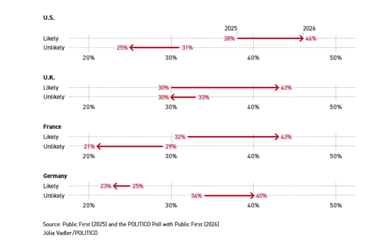 Η μετατόπιση σε σχέση με το πρόσφατο παρελθόν αποτυπώνεται και στη σύγκριση με αντίστοιχο ερώτημα που είχε τεθεί από την ανεξάρτητη εταιρεία Public First τον Μάρτιο του 2025. Ο επικεφαλής δημοσκοπήσεων της Public First, Σεμπ Ράιντ, σημείωσε ότι η αλλαγή στη δυτική κοινή γνώμη «σε λιγότερο από έναν χρόνο» δείχνει έναν κόσμο όπου ο πόλεμος αντιμετωπίζεται ως ρεαλιστικό ενδεχόμενο και οι συμμαχίες ως λιγότερο σταθερές.