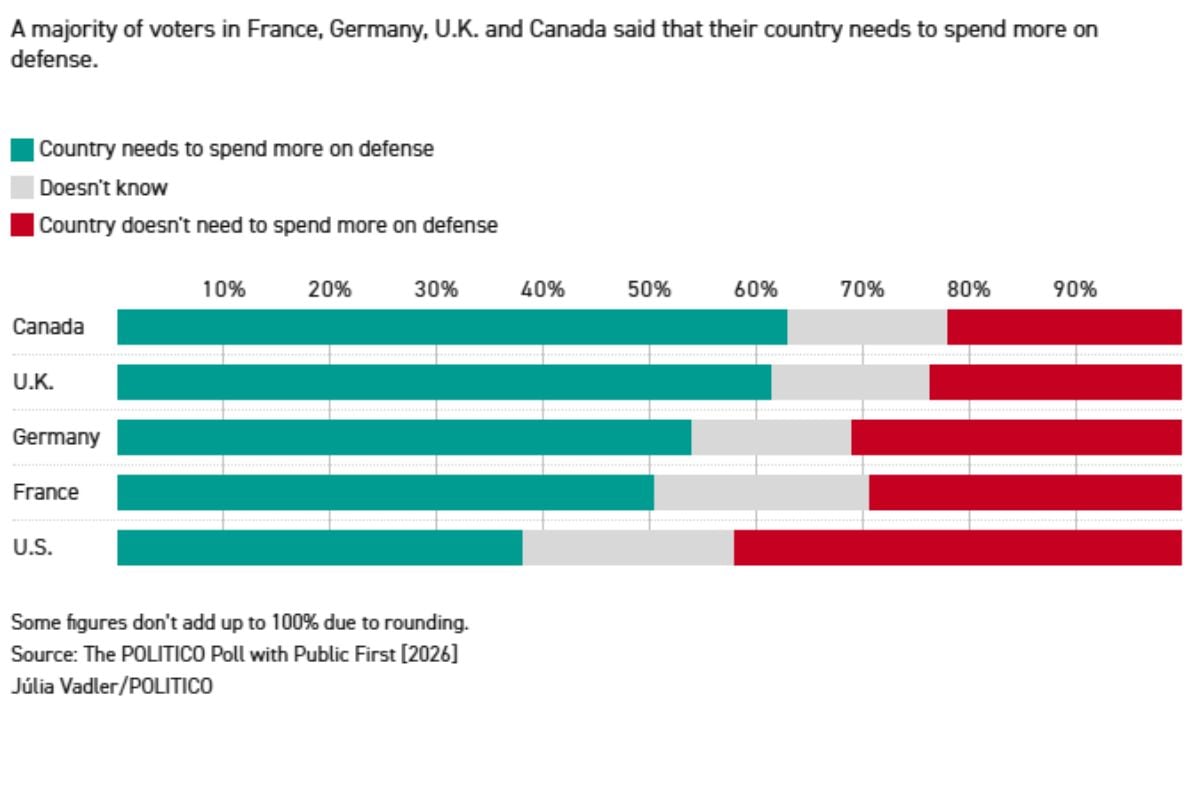 Παρά τον αυξημένο φόβο για πόλεμο, η δημοσκόπηση δείχνει ότι οι κοινωνίες δεν είναι έτοιμες να αποδεχθούν εύκολα το οικονομικό βάρος μιας μεγάλης αύξησης δαπανών. Στη Γαλλία, τη Γερμανία, το Ηνωμένο Βασίλειο και τον Καναδά η πλειοψηφία δηλώνει ότι χρειάζονται περισσότερα χρήματα για την άμυνα, με ισχυρότερη στήριξη στο Ηνωμένο Βασίλειο και τον Καναδά. Όταν όμως τίθεται το «πώς πληρώνεται», η υποστήριξη υποχωρεί αισθητά.