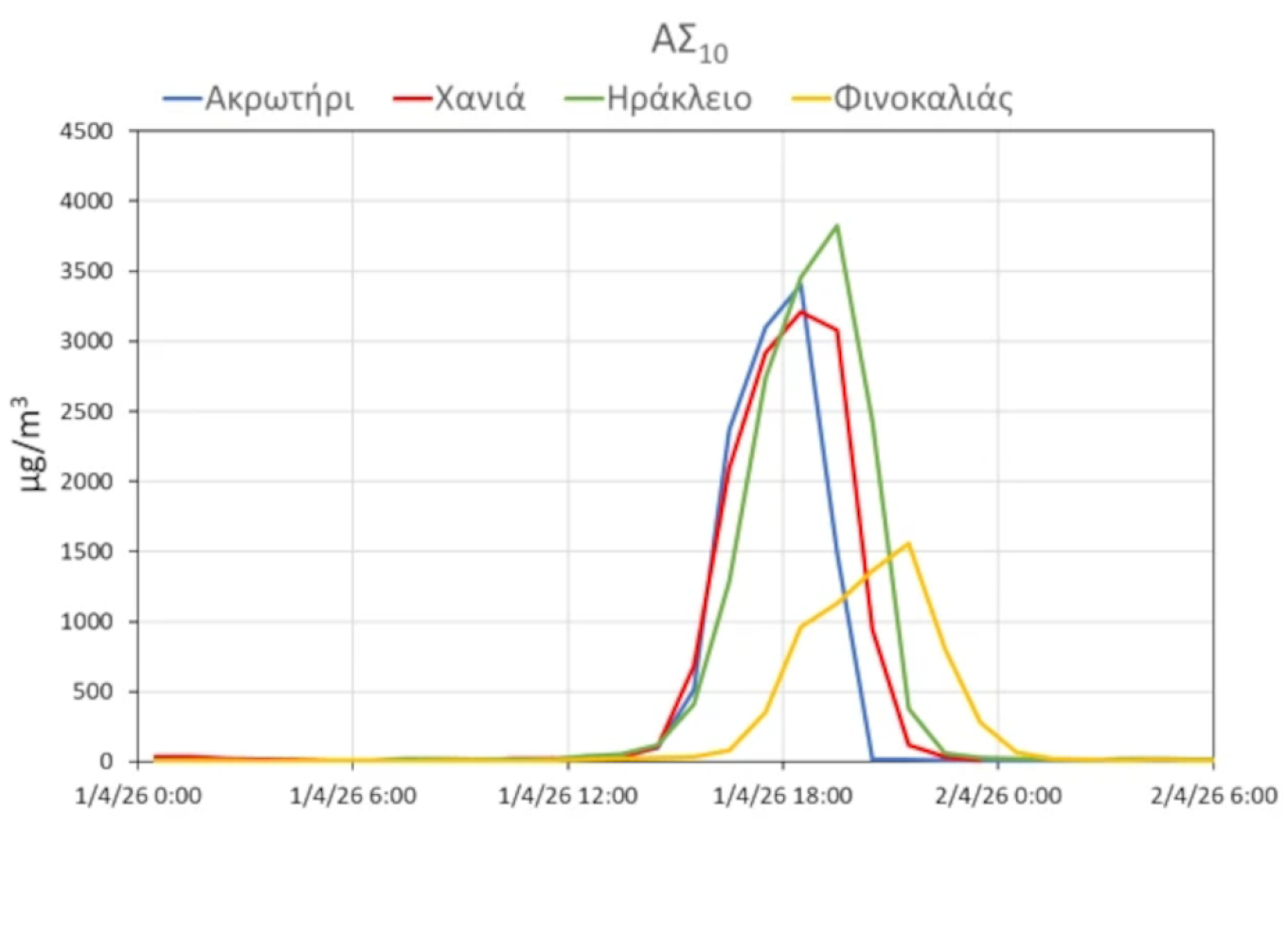 Η πορεία και η ένταση του φαινομένου καταγράφηκαν σε πραγματικό χρόνο από τέσσερις σταθμούς του Δικτύου ΣΧΕΔΙΑ Κρήτης, οι οποίοι παρακολουθούν τα επίπεδα σωματιδίων ΑΣ10 σε Χανιά, Ακρωτήρι Χανίων, Ηράκλειο και Φινοκαλιά.