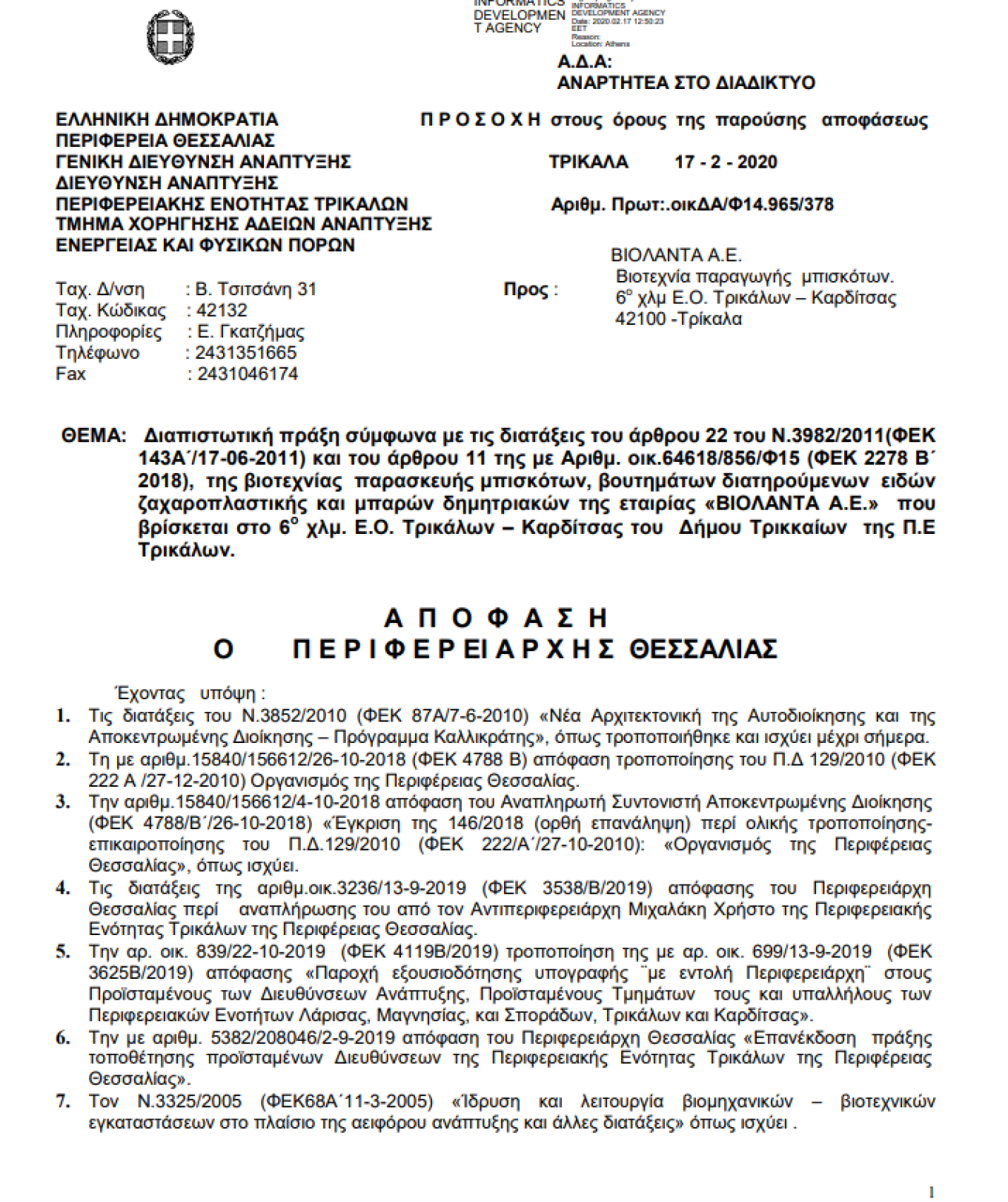 Σε έγγραφα που έχουν επίσης έρθει στο φως σχετικά με το εργοστάσιο Βιολάντα καταγράφεται και ένα ακόμη κρίσιμο στοιχείο. Το 2020, σε έγγραφο της Περιφέρειας Θεσσαλίας, σημειώνεται ότι οι δύο δεξαμενές προπανίου του εργοστασίου δεν είχαν τοποθετηθεί στο σωστό σημείο, γεγονός που πλέον εξετάζεται σε συνδυασμό με τις συνθήκες που οδήγησαν στο δυστύχημα.
