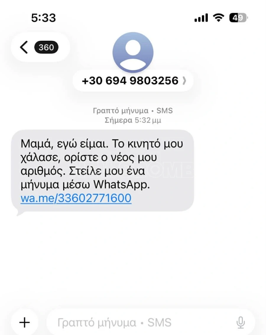 Στη συγκεκριμένη περίπτωση, οι απατεώνες στοχεύουν μητέρες, στέλνοντας μήνυμα από τον αριθμό 6949803256 με το περιεχόμενο: «Μαμά, χάλασε το κινητό μου και αυτός είναι ο νέος μου αριθμός. Στείλε μου μήνυμα στο WhatsApp».