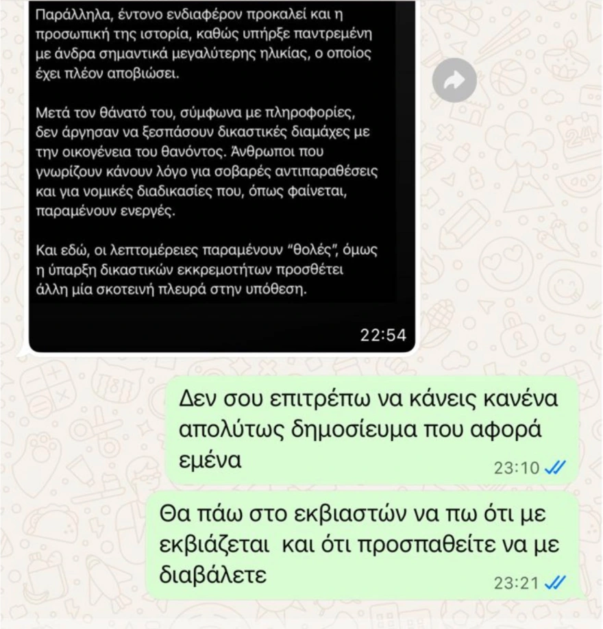 Σε αντίθετη περίπτωση, ξεκαθαρίζει ότι θα κινηθεί νομικά, τόσο σε ποινικό όσο και σε αστικό επίπεδο, διεκδικώντας παράλληλα αποζημίωση για την ηθική βλάβη που, όπως υποστηρίζει, έχει υποστεί.