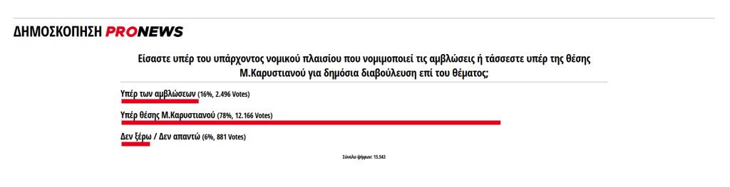 Σε ότι αφορά την δημοσκόπηση του proneww.gr στο ερώτημα αν είσαστε υπέρ του υπάρχοντος νομικού πλαισίου που νομιμοποιεί τις αμβλώσεις ή τάσσεστε υπέρ της θέσης Μ.Καρυστιανού για δημόσια διαβούλευση επί του θέματος οι αναγνώστες δήλωσαν, σε ποσοστό 78% (συνολικά ψήφισαν 15.545 άτομα σε 30 ώρες) ότι ε΄ναι υπέρ της θέσης της Μ.Καρυστιανού!