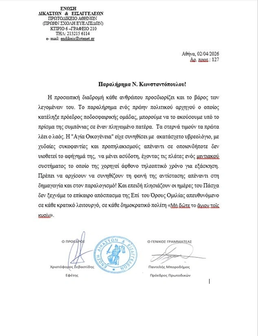 Η Ένωση Δικαστών και Εισαγγελέων εξέδωσε ανακοίνωση κατά του Νίκου Κωνσταντόπουλου η οποία φέρει τον τίτλο «Παραλήρημα Ν.Κωνσταντόπουλου!».