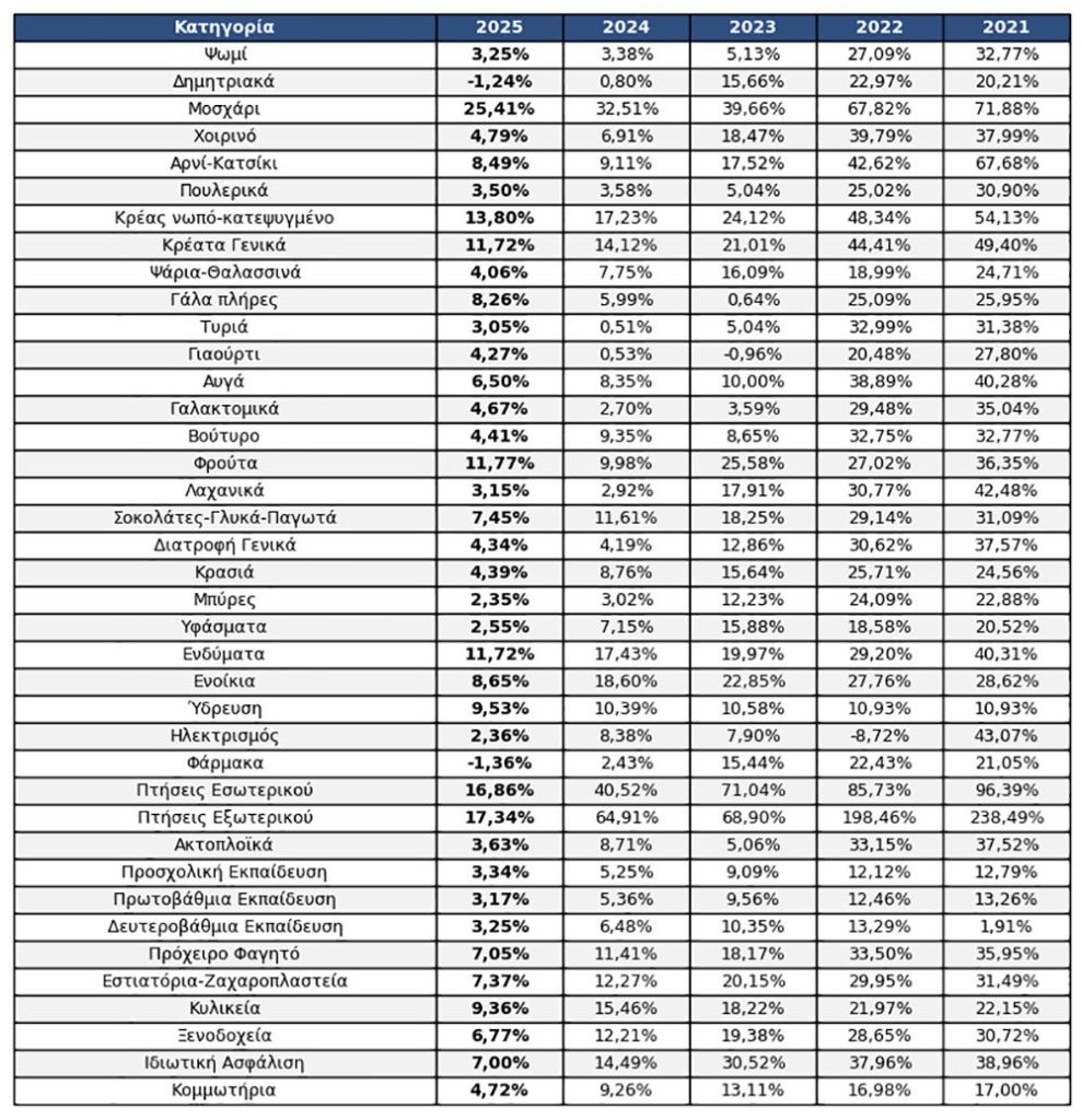 Πίνακας από την εγκύκλιο της Γενικής Γραμματείας Εμπορίου που δείχνει τις αυξήσεις στις τιμές των προϊόντων και των υπηρεσιών από το 2021 έως το 2025 προκαλεί πραγματικά σοκ.