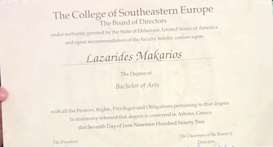 Ο υφυπουργός Αγροτικής Ανάπτυξης, Μακάριος Λαζαρίδης, παρουσίασε ζωντανά το πτυχίο που απέκτησε το 1992 από το The College of Southeastern Europe, υποστηρίζοντας ότι το 2007 ήταν δυνατή η εργασία ως μετακλητός υπάλληλος ακόμη και με μια τέτοια βεβαίωση σπουδών, παρότι δεν αποτελούσε αναγνωρισμένο τίτλο.