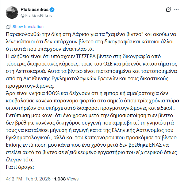 Σε ανάρτησή του μετά την έναρξη της δίκης στη Λάρισα για τα «χαμένα» βίντεο όπως ισχυρίστηκε η Μαρία Καρυστιανού, που σημαδεύτηκε και από ένταση, ο Ν.Πλακιάς τονίζει χαρακτηριστικά: «Η αλήθεια είναι ότι υπάρχουν ΤΕΣΣΕΡΑ βίντεο στη δικογραφία από τέσσερις διαφορετικές κάμερες, τρεις του ΟΣΕ και μία ενός καταστήματος στη Λεπτοκαρυά. Αυτά τα βίντεο είναι πιστοποιημένα και ταυτοποιημένα από τη Διεύθυνσης Εγκληματολογικών Ερευνών και τους δικαστικούς πραγματογνώμονες.